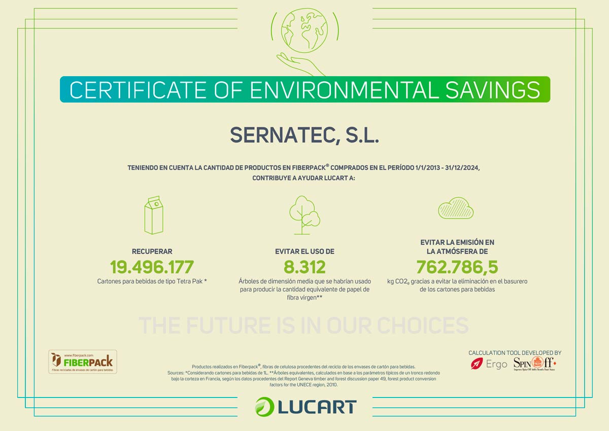 Lucart Profesional a través de Sernatec Hygiene certifica a sus clientes por el consumo de Celulosa Eco Natural, la cantidad de envases para bebidas líquidas recuperados, la cantidad de árboles de tamaño medio no talados, y la reducción de emisiones de CO2 al medio ambiente.